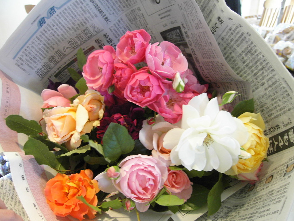 方々に咲いてる花たちも、一か所に集めてギュッと包むとこんなにかわいくてボリューミーに!地元新聞が包装紙、というのも、観光客の皆様に好評w