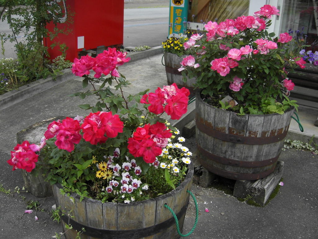 大きな樽にハマってバラを入れたら、以来それを使って寄せ植えするのにもハマりました。ピンクノックアウトです。