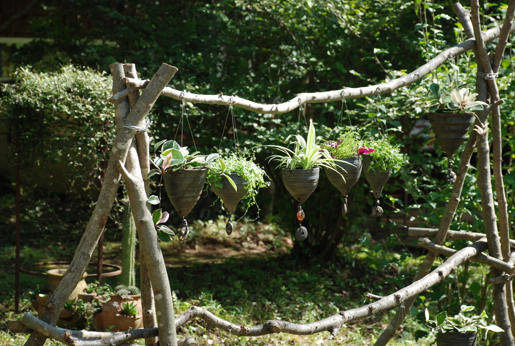 吊り鉢も含めて全てがお手製なんでしょうね。とっても和む素適なディスプレーですね。