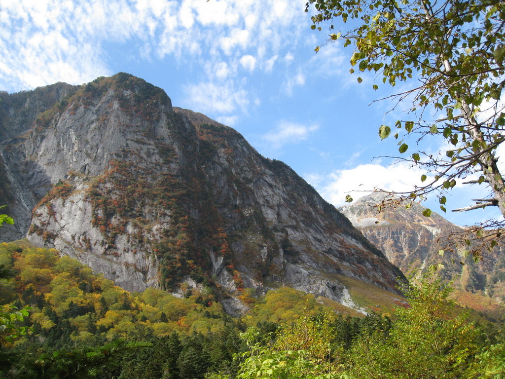 上高地から歩いて歩いて 井上靖著「氷壁」の舞台になった屏風岩です。奥に北穂高が見えてます。