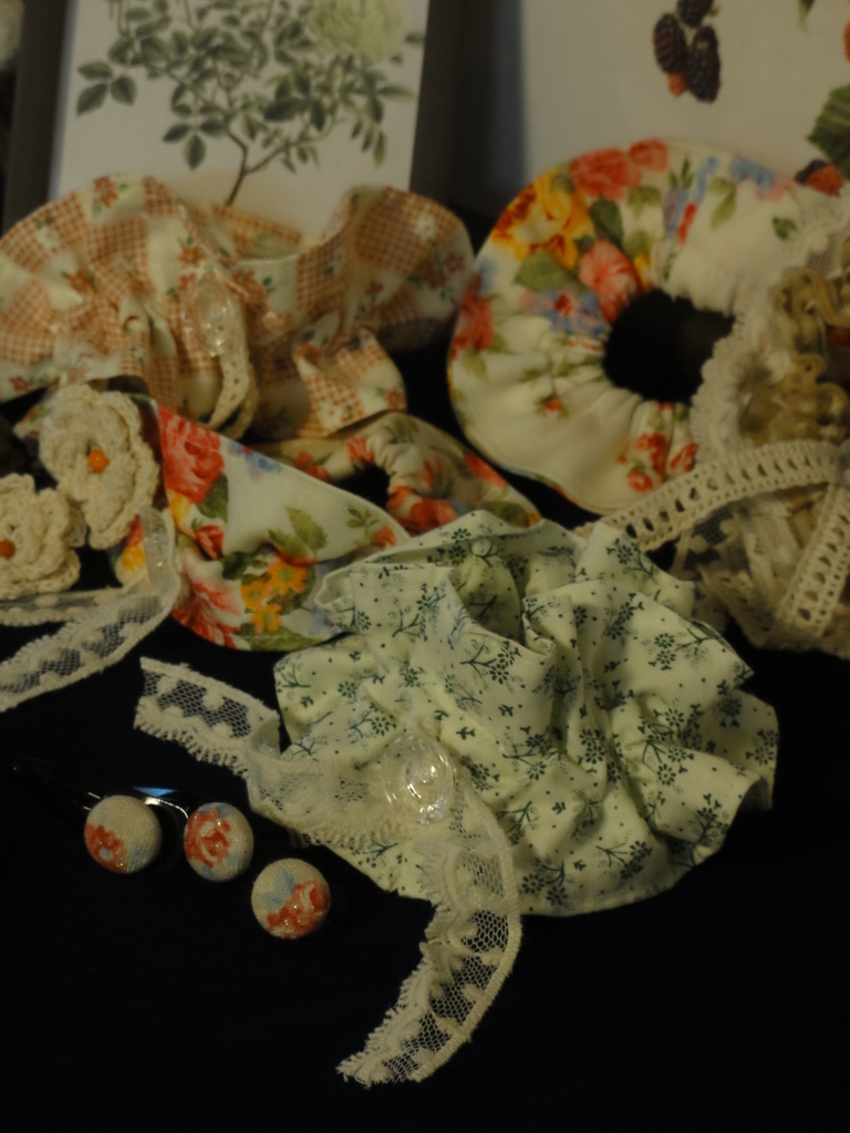 自分では、一番手前のシュシュと、薔薇の模様のくるみボタンの髪留めが気に入っています。