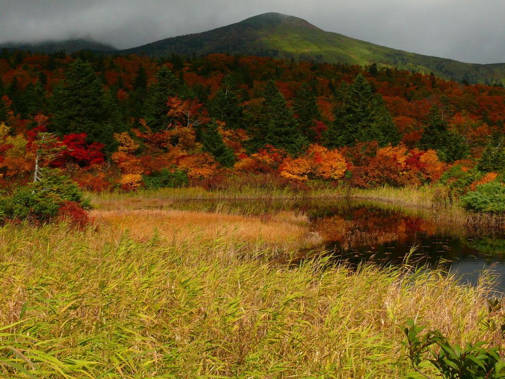 針葉樹と広葉樹が入り交ざった紅葉が 妙に不思議な感じがします。緑一色の山頂付近とのバランスも絶妙。こんな紅葉風景もあるんですね。私には、すごく新鮮に感じます。