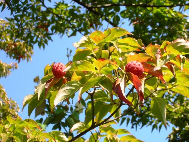 こちらではヤマボウシは、実が赤くなるとともに葉も赤く紅葉していますよ。