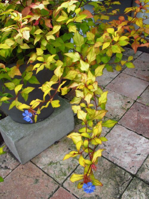 黄色い葉が本来の葉の色、グリーンぽい葉は日陰になっていた葉、そして少しずつ赤く染まってきた葉っぱ・・・それぞれの色がほんのり交じり合い日に日に秋色に移ろう。