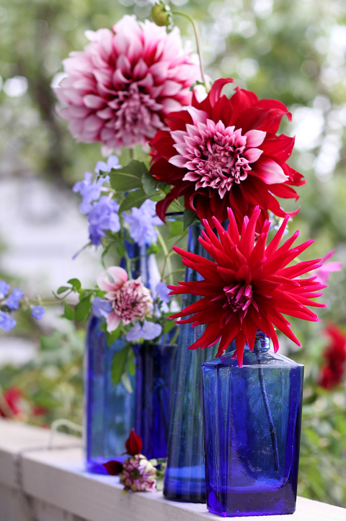 青いガラスに赤系のダリアとブルーの小花が美しいですね!土曜日に降った大雨、夜間は風も強かったらしく、我が家でもせっかく台風後に再生してきたダリアの枝や台風に耐えた黒蝶の枝がパッキリ折れていました。今年はバラもダリアも受難の年ですね。