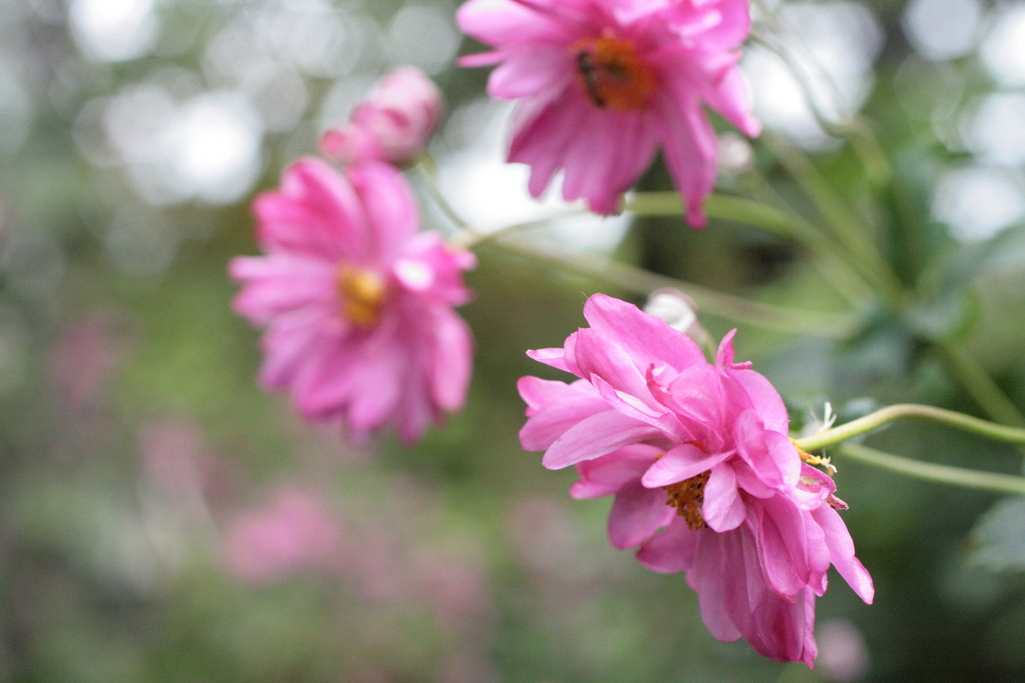 八重のシュウメイギク、キレイですネ!でもやっぱり倒れたものはなおしてあげてください。年頃の子どもたちは花よりファッション。私もしょっちゅう子どもたちに「セージが服にあたってくさい!」とか「バラが飛び出してきて通路が狭い」とか言われます(笑)