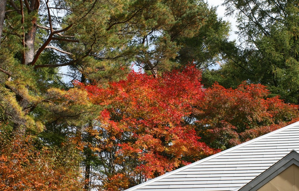 東屋の屋根越しに綺麗な紅葉が見えます。