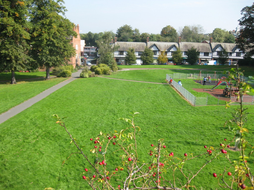 手前にはローズヒップの赤い実があって、広い芝生の中の公園で子供達が遊んでいる、奥には如何にも英国風のわらぶき屋根の家が並んでいる、のどかな田舎町の秋の素適な風景ですね。