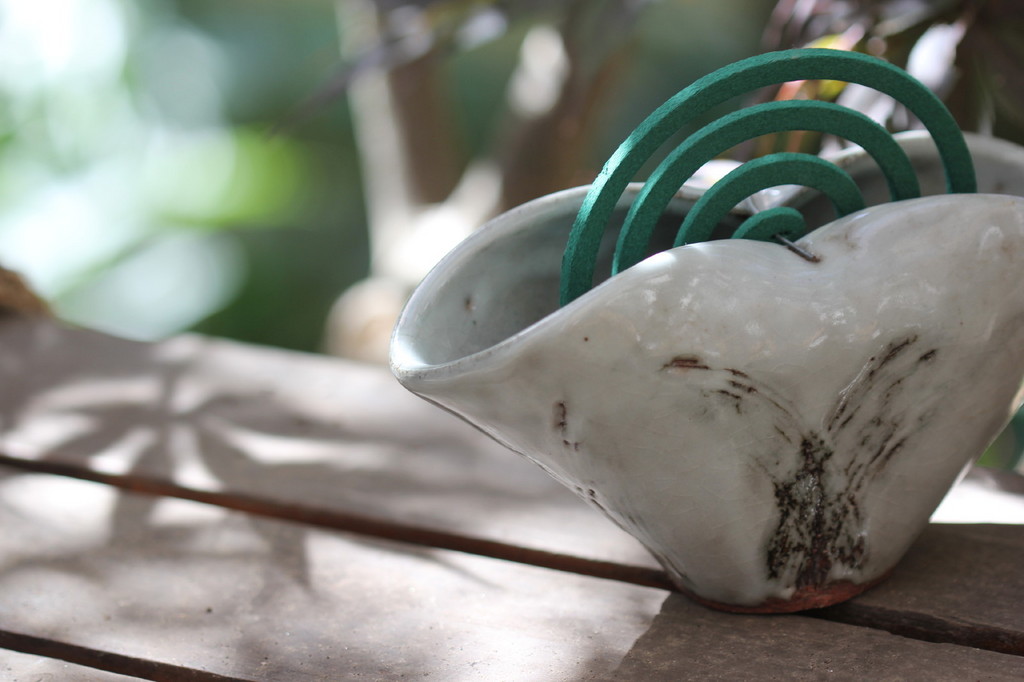 おしゃれな器ですね。これなら庭に置いてもいい感じ!まだ庭では蚊取り線香が活躍してますが、金鳥と書いた金物です。(^_^;)