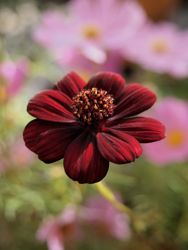 薄いピンクのコスモスを背景にチョカ・モカさんの濃い赤が引き立ってますね。
