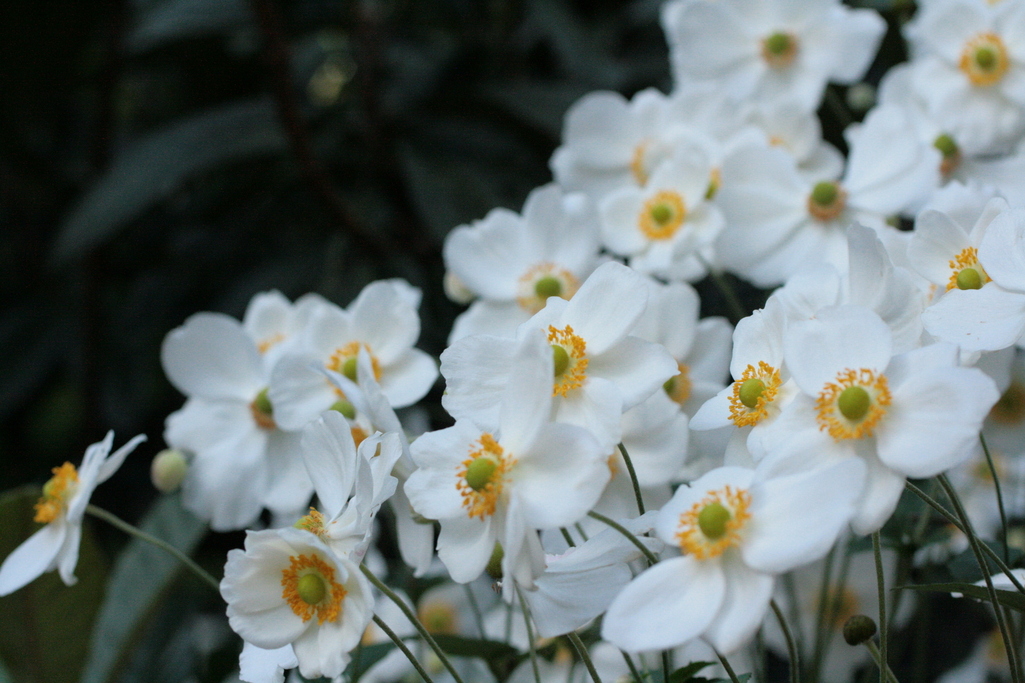 真っ白なシュウメイギクが一斉に同じ方向を向いて咲いている光景は、コメントの表現にピッタリですね。