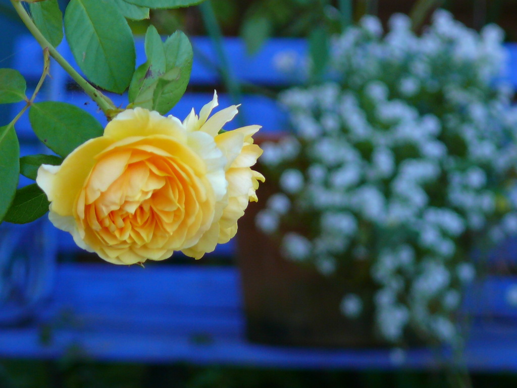 青いベンチをバックにアピールしているグラハムトーマス。自分の美しさを知っているのでしょう。とても綺麗な薔薇です。