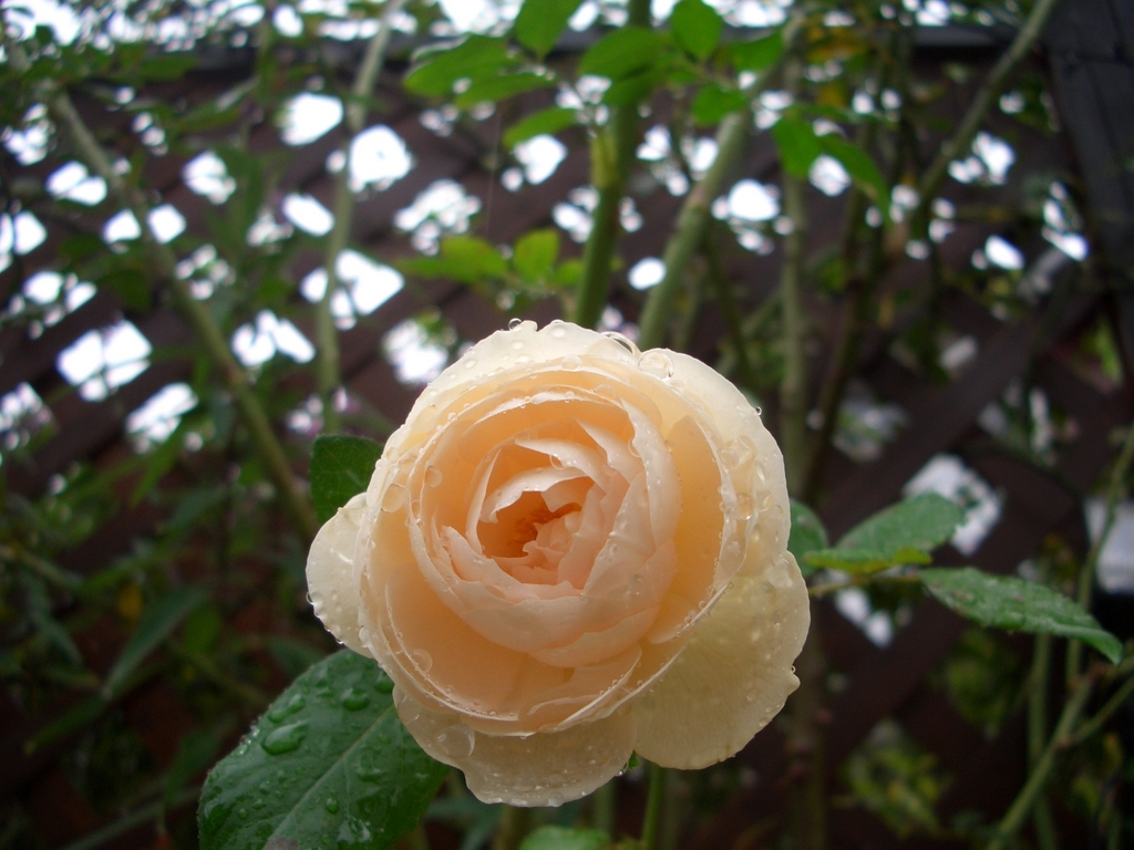 やわらかな色の優雅な薔薇ですね。雨にぬれてもいい感じです。