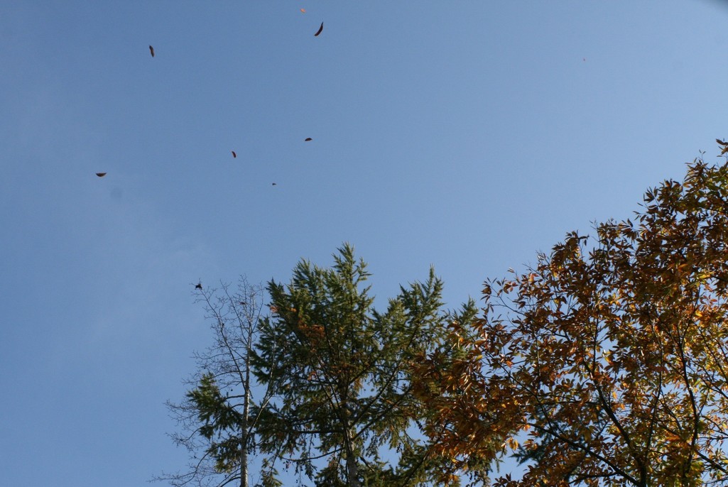 うちの庭の栗の木からも、風に吹かれた落ち葉が青空をバックに舞い散っています。