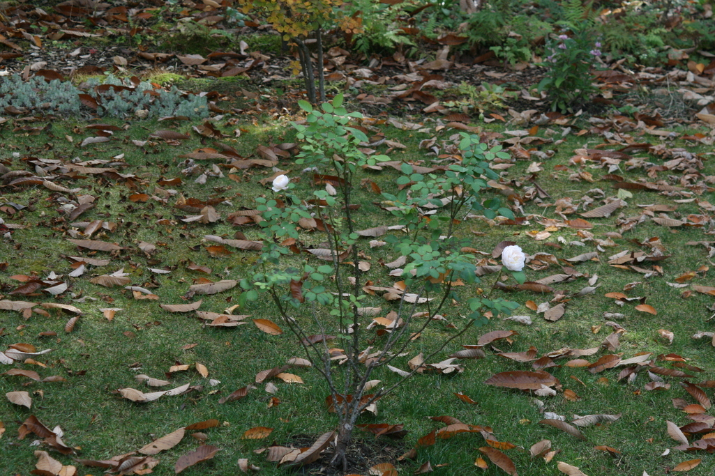 芝生にグラミスキャッスルが花をつけていますが、とってもとっても次から次に落ちてくる落ち葉で埋め尽くされ、折角の花もかわいそう。