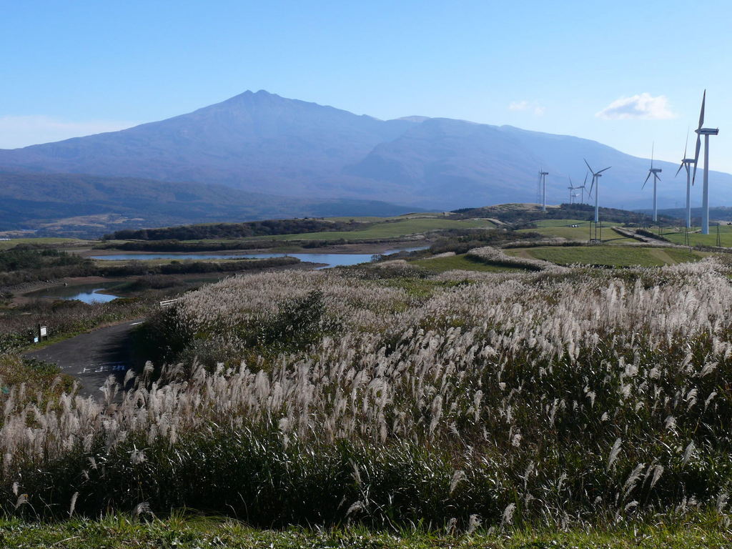 ススキが原の向こうに鳥海山がそびえてとても素適な風景ですね。でも風力発電用の風車がたくさんあるところを見ると、結構風が吹くところなんでしょうね。