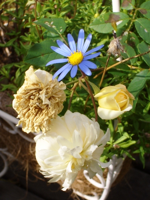 ほとんど枯れてしまって放置していた寄せ植えに、アリスタ・ステラ・グレイ(鉢植え)が寄り添って・・・青い花はブラキカムだったかな・・・?