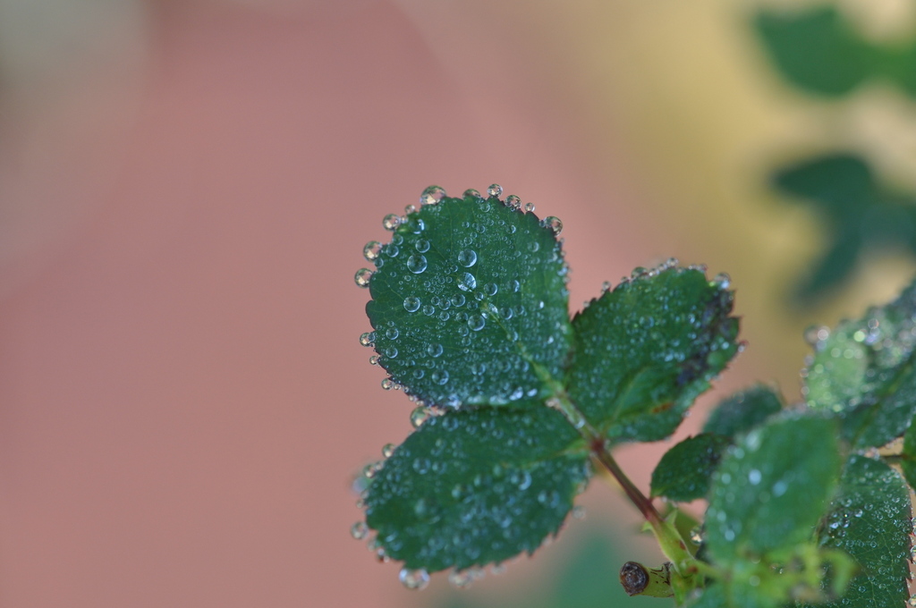 薔薇の三枚葉は、何時もちょんちょんと切られているけどこんなに水滴がつているとすてられないね