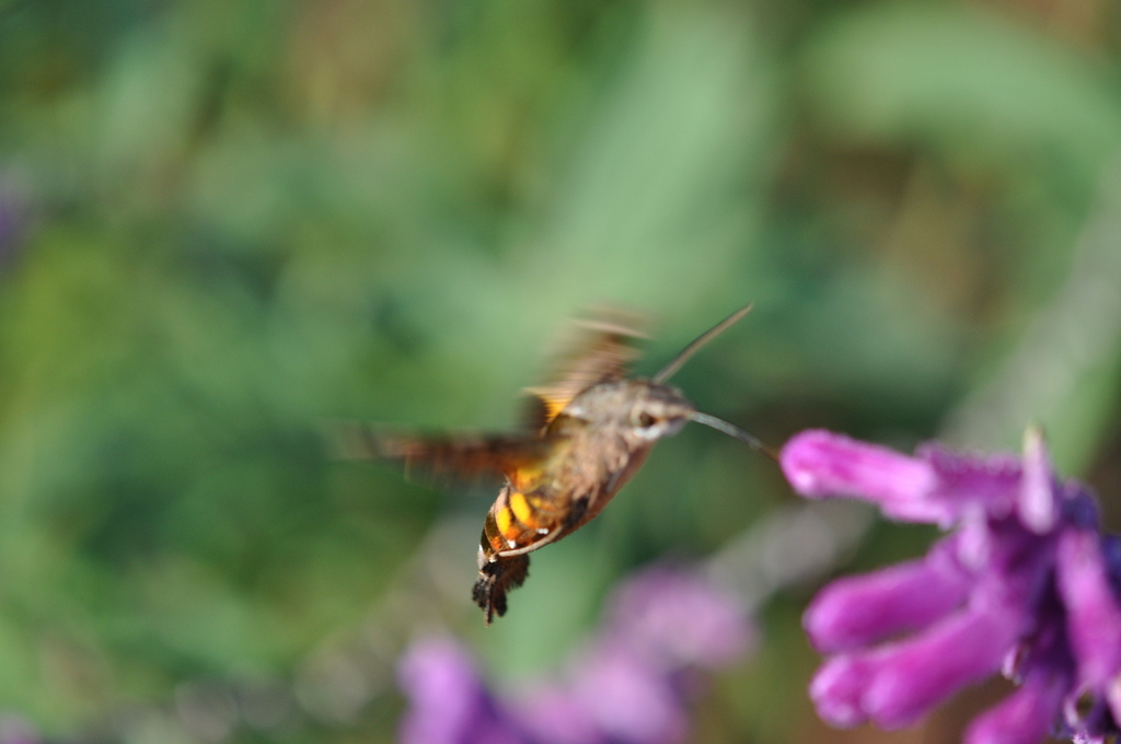 スズメガって言うのですね。我が家にもたくさんいるのですが、蜂とも違うし、名前を知りたかったのとっても嬉しいです。ミツバチたちより働き者な動きですよね。