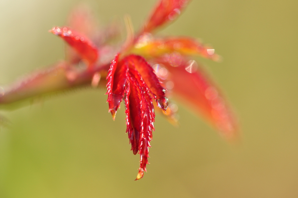 赤い新芽が濡れた姿はとても綺麗ですね。
