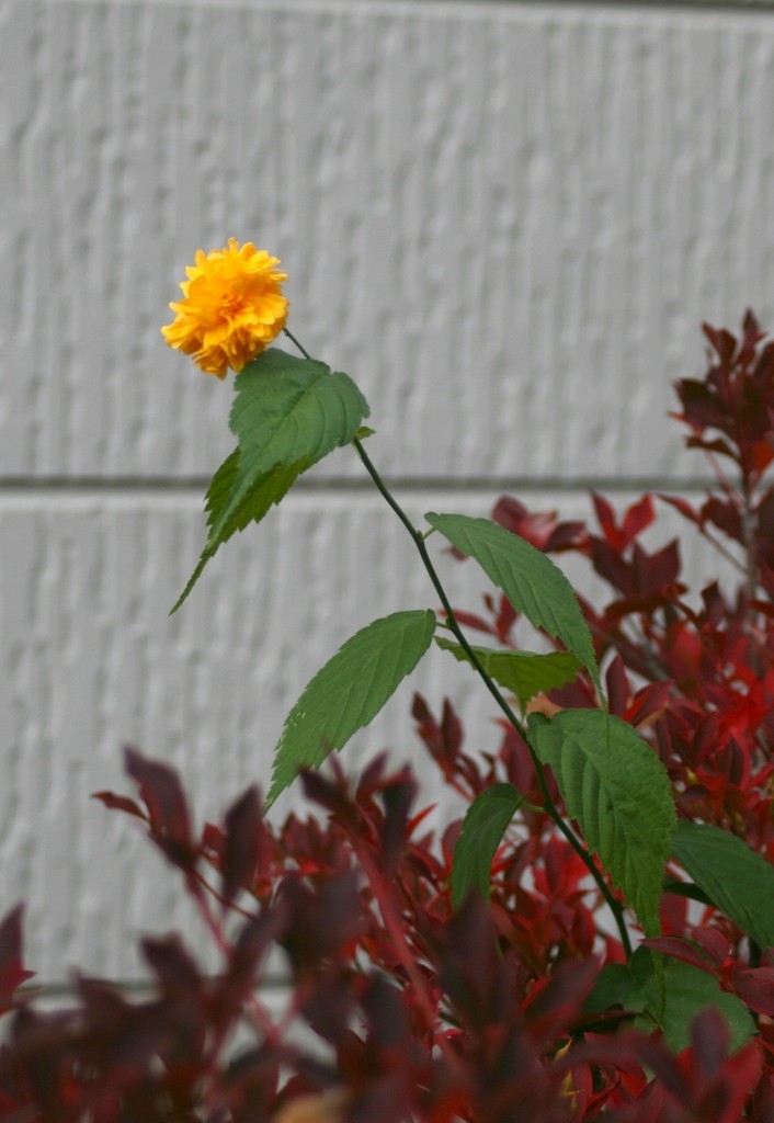 散歩中に見つけたのですが、真っ赤に紅葉したドウダンツツジの間から、黄色い八重の山吹が顔を出していました。今頃どうして。