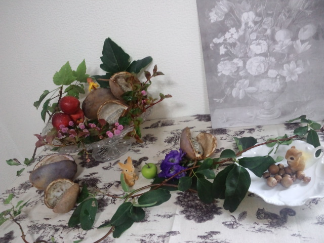 アケビとアルプスの乙女ですね。。以前小倉に住んでいたころは庭でアルプスの乙女がたくさんなっていましたし、アケビも普通に見かけましたが、こちらではどちらも出来ません。