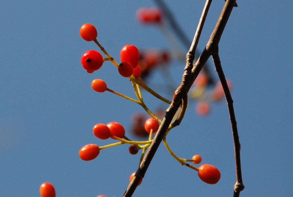 少しくすんだ空のブルーとオレンジ色の取り合わせが心に残るお写真です。アズキナシという植物は見たことがありませんが白い花が咲くのでしょうか。