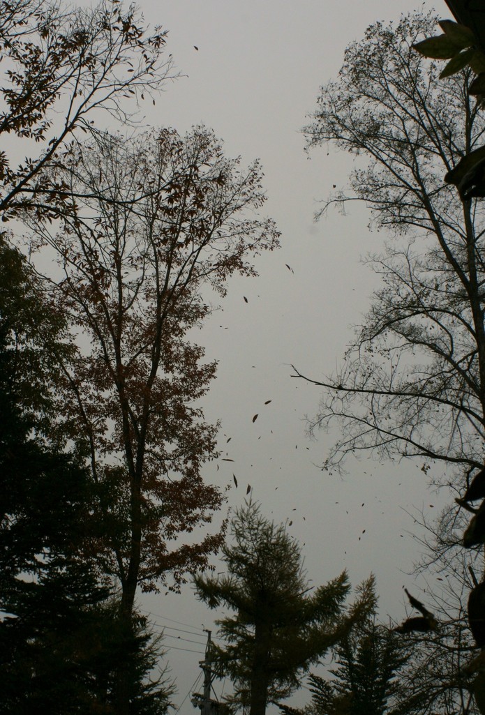 今にも降り出しそうな曇り空からは、風に揺られた枝から落ち葉がパラパラと降ってきました。