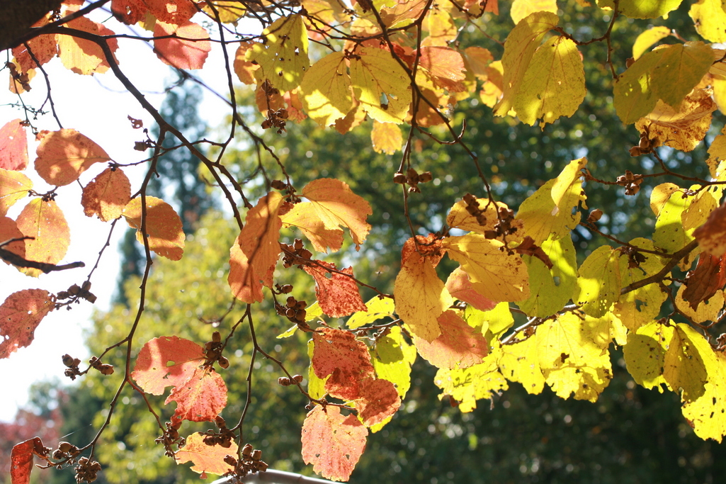 二つのマンサクがかさなって秋の日に透けて見えるなんて、素敵ですね。