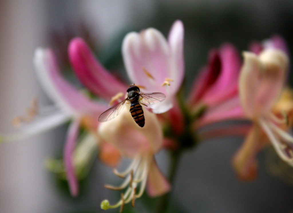 ハチか花アブでしょうか。1㎝にも充たない虫です。