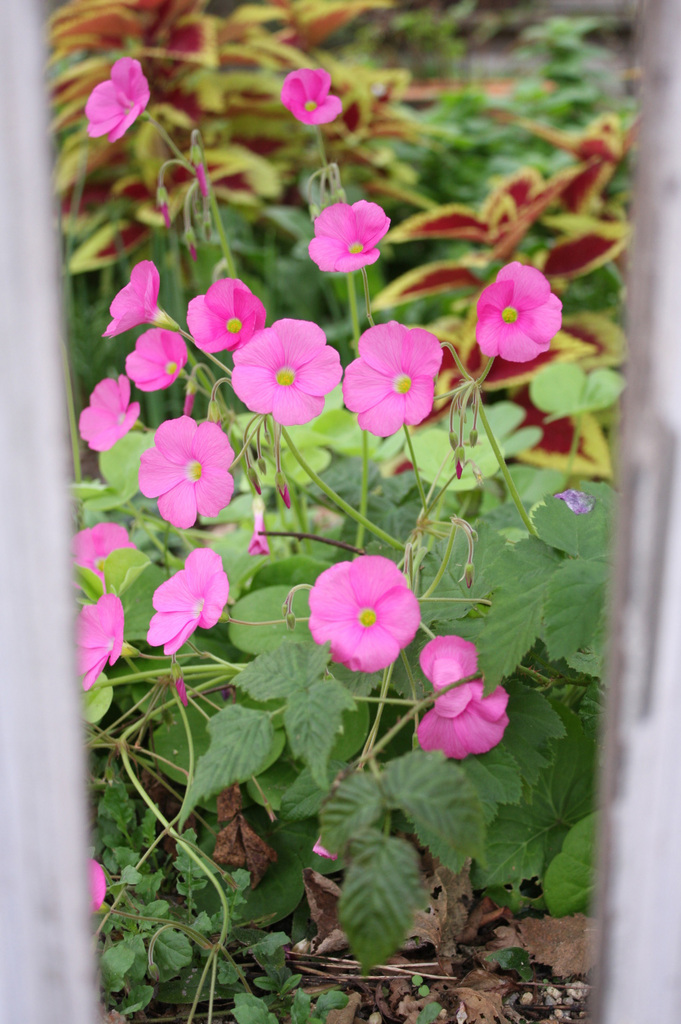 柵の外から見たオキザリス。家に背を向けて咲いています。