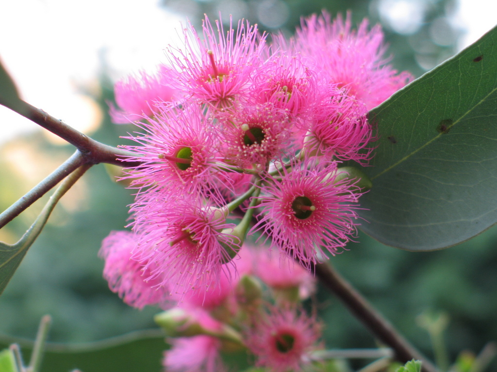 ユーカリの花が開花中です。日本では極めて珍しい品種の開花です。 今回のオープンガーデンの目玉です。 品種はEucalyptus sideroxylon rosea