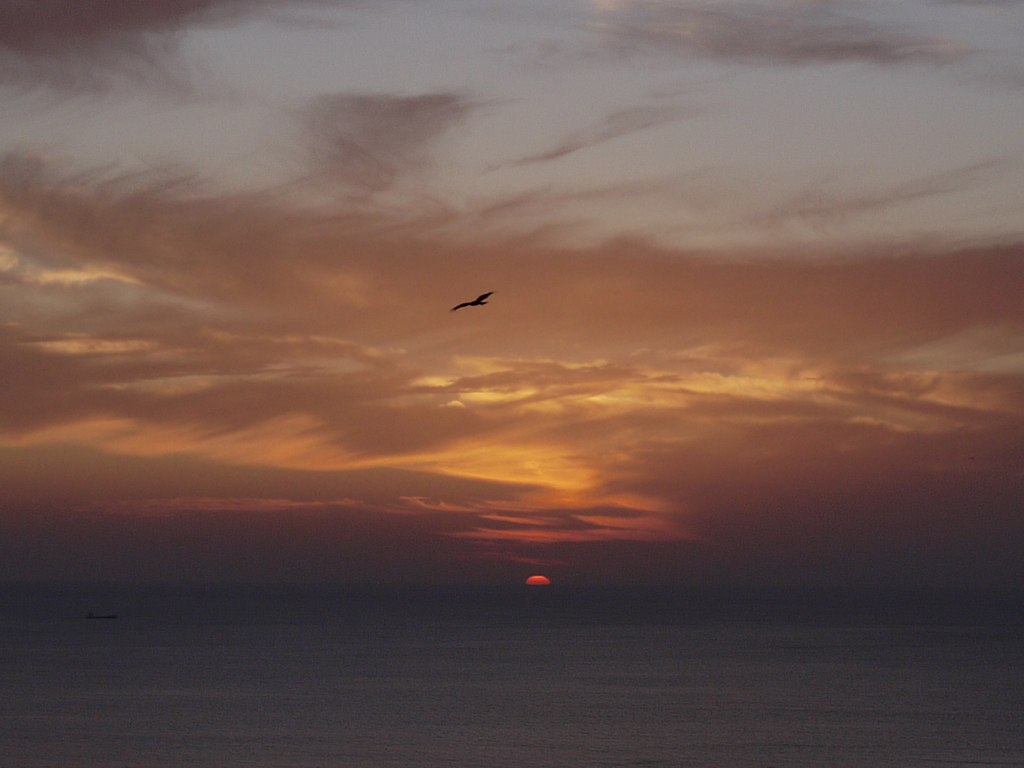 夕焼け雲の中にはワシのシルエットが浮かび、暗くなりかけた海には船が浮かび、水平線には半分隠れた赤い太陽、もう言う言葉がありません。ほんとにすばらしい夕景ですね。