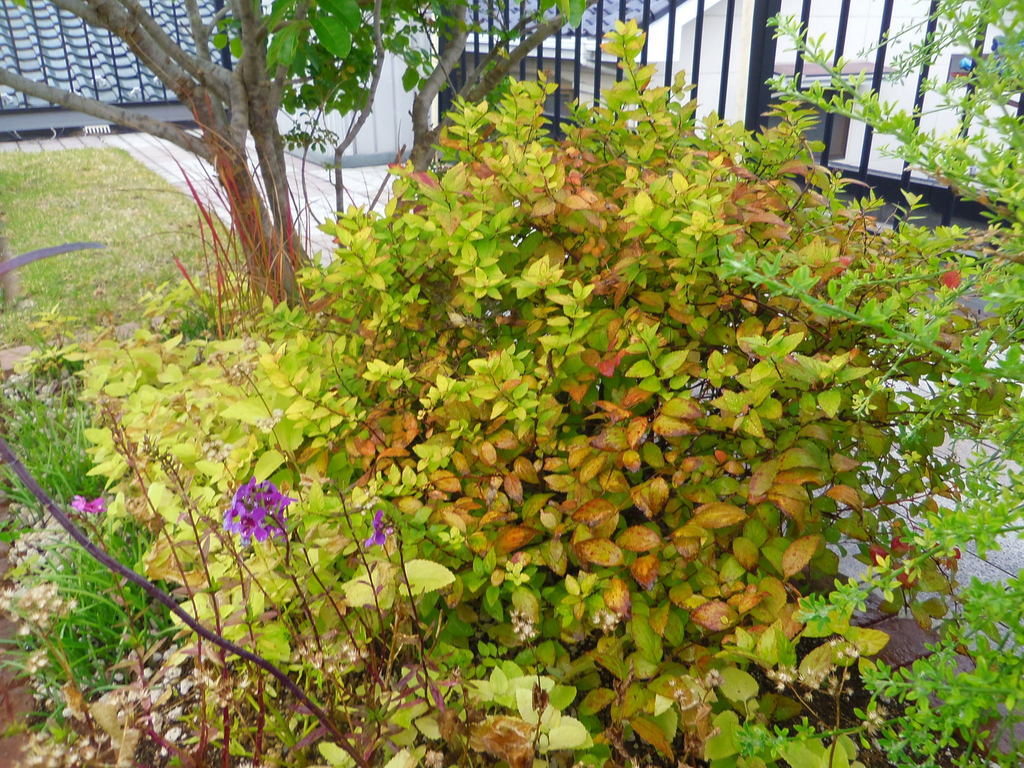 我が庭の数少ないおりこうさんの一つ、シモツケライム何とかです。花よし、芽吹きよし、紅葉よし、落葉した枝もきれい、樹形はコンパクトで乱れません。