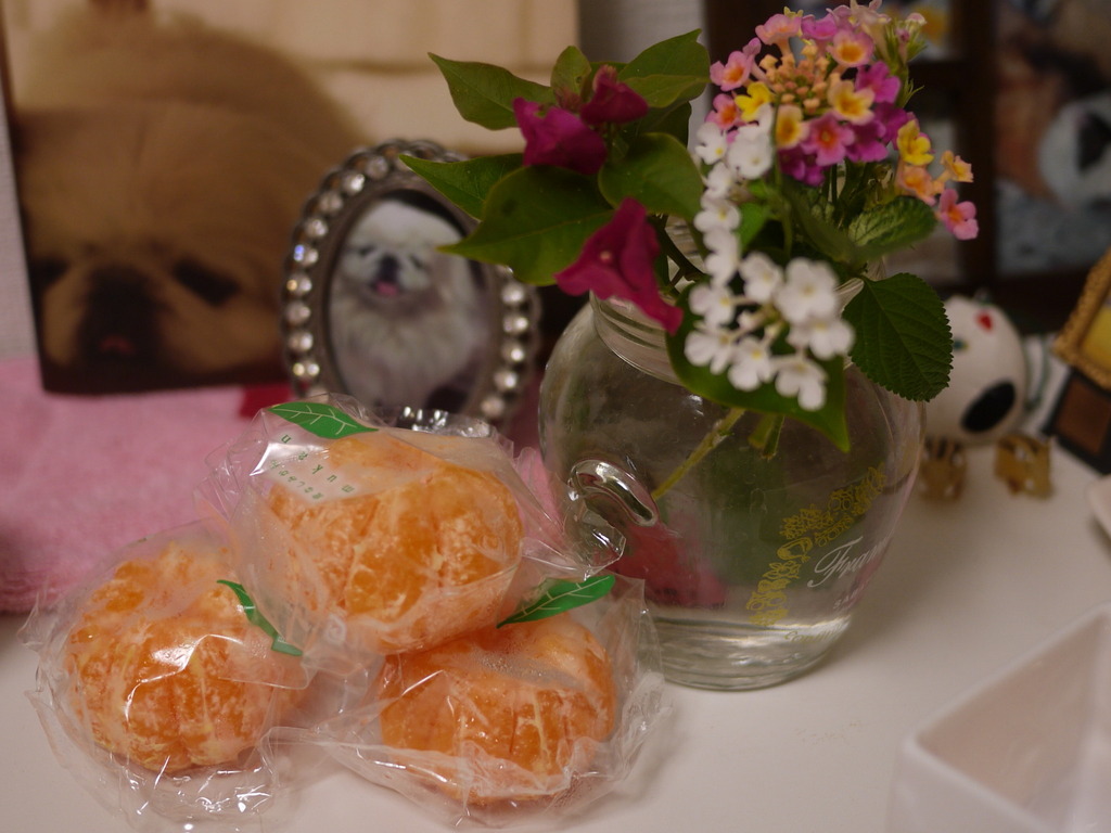 写真に花、お供えもしてもらって幸せですね!うちではミカンを買ってくると息子が必ず冷凍庫へしまいます・・・。息子よ、ミカンの保存は別に冷凍にしなくてもいいんだよ^^;!