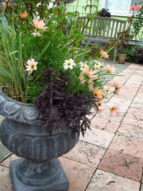 素敵な寄せ植えですね。おうちの壁のミントグリーンの色が素敵!
