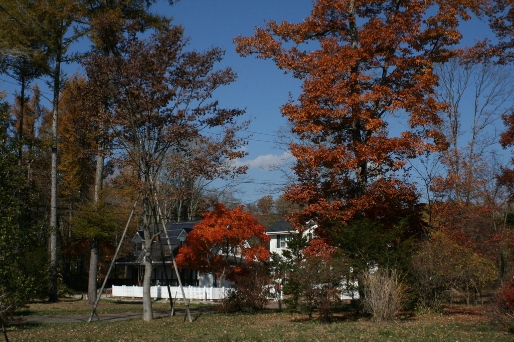 白壁に白い柵のおうちの庭には赤く紅葉したカエデがとっても綺麗です。