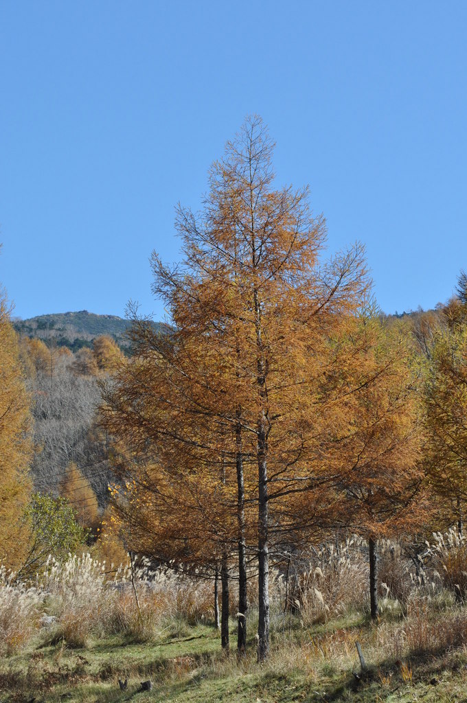 落葉松と書いてカラマツ、秋には黄色く紅葉して全ての葉(といっても2~3cmほどの針状)を落とします。高さが20m以上もある落葉松の林が色付くと壮観ですよ。