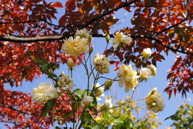 青空と赤く紅葉したヤマボウシをバックにバラがのびのびと咲いていますね。