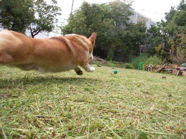 綺麗に雑草を切ってもらってとってもうれしそうに飛んでいますね。うちのクーチャンも芝生の上でゴルフボールを追いかけるのが大好きです。