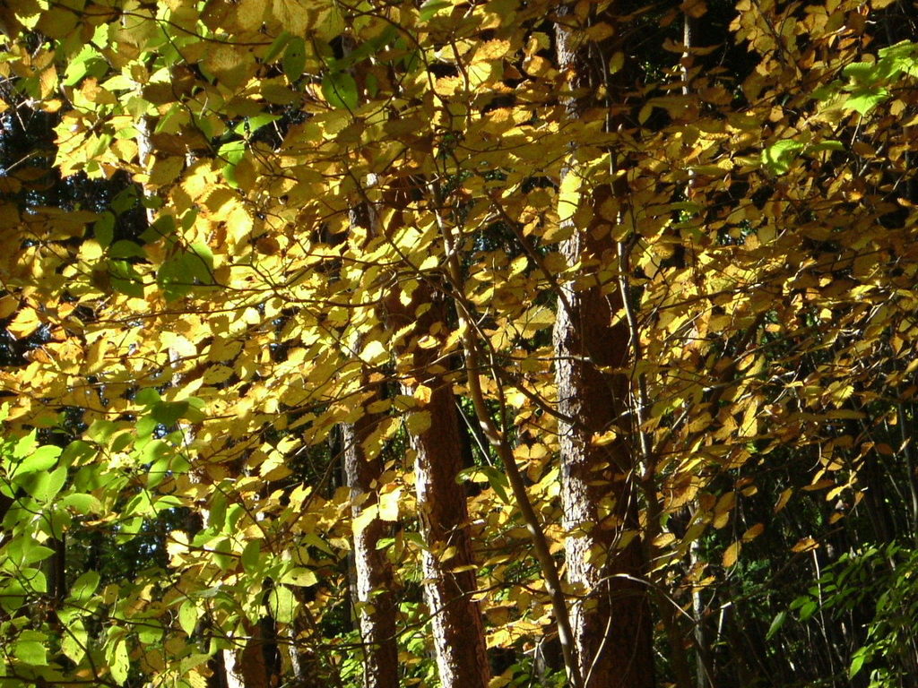 木漏れ日が黄色く色付いた木の葉にあたってとってもきれいですね。