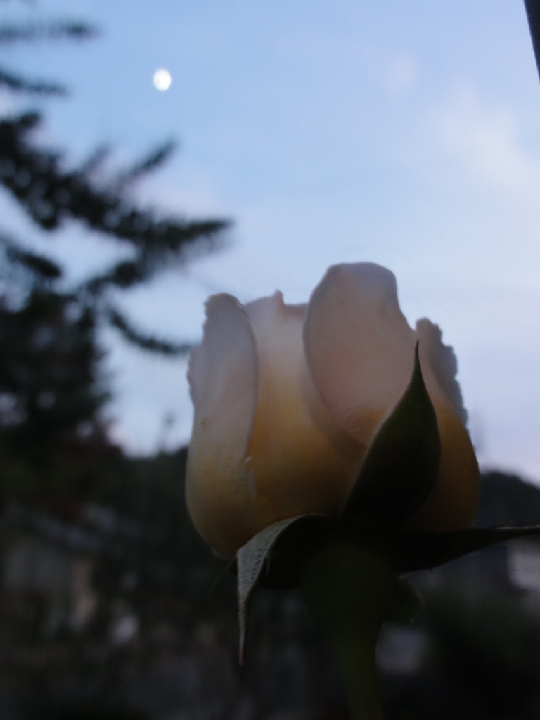 夕暮れの空に浮かぶお月様と開きかけのバラがとってもいい感じで癒されますね。
