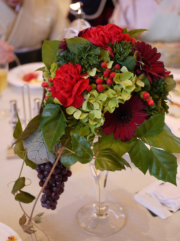 ブドウ、本物ですよね。私も見たことないです。季節感があってとっても素敵なアレンジ♪