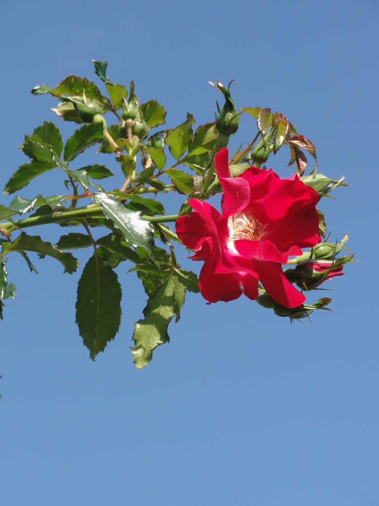 秋の青空に映える真っ赤なバラ、葉もピカピカですね。