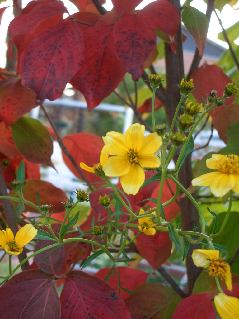 ヤマボウシの赤く紅葉した葉とウインターコスモスの黄色がとっても鮮やかですね
