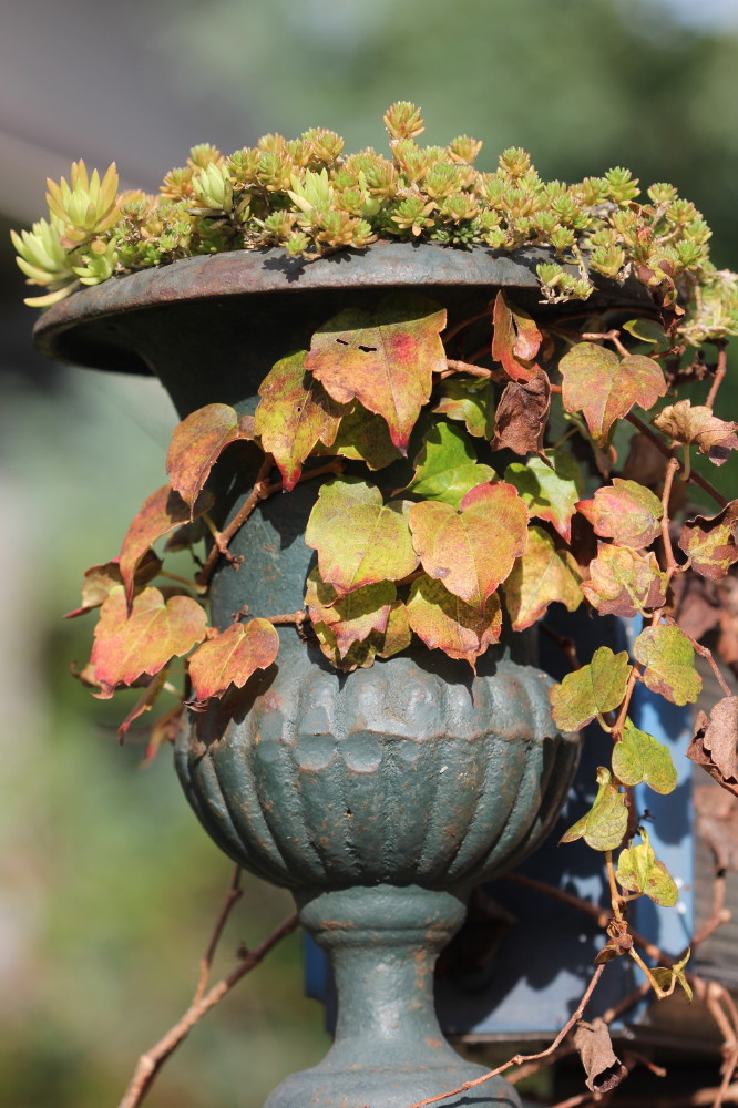 少し色付いたセダムの鉢に撒きついたアイビーが紅葉してとっても素適ですね。