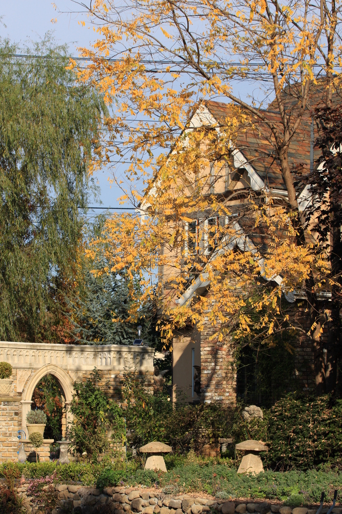 色づいているのはニセアカシアでしょうか?屋根の色、壁の色、針葉樹の葉の色、すべてが計画的に配置されているんですね。すごいなあ。