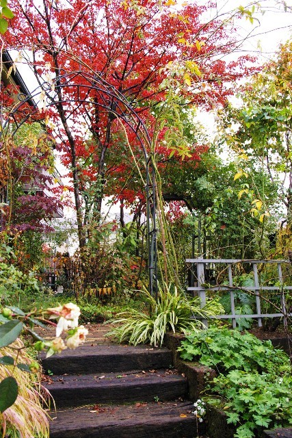 段差のあるお庭、いいですね。わが家の庭は狭くてフラットで工夫のしようがありません。下から見るとアーチも一層迫力があるのでは。