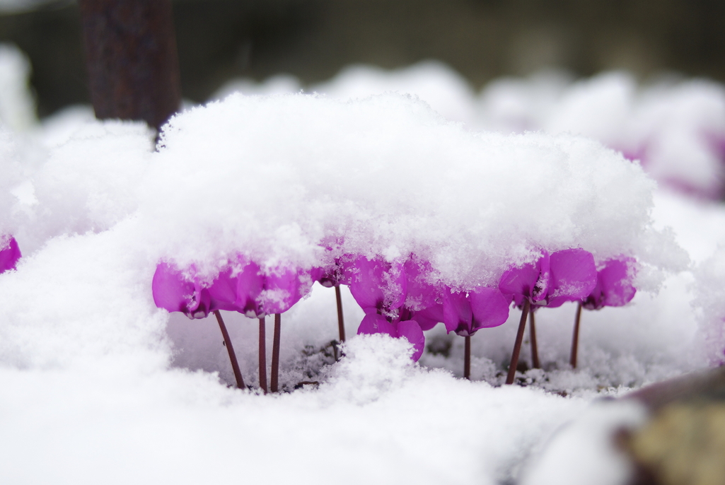 真っ白な雪と、シクラメンコウムのピンクが、綺麗ですね^^細い花茎なのに、みんなで、雪を支えてる?^^