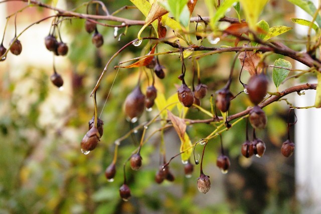 秋から冬への移り変わりを感じます。雨が茶色になった実をつやつや光らせてくれていますね(*^^*)